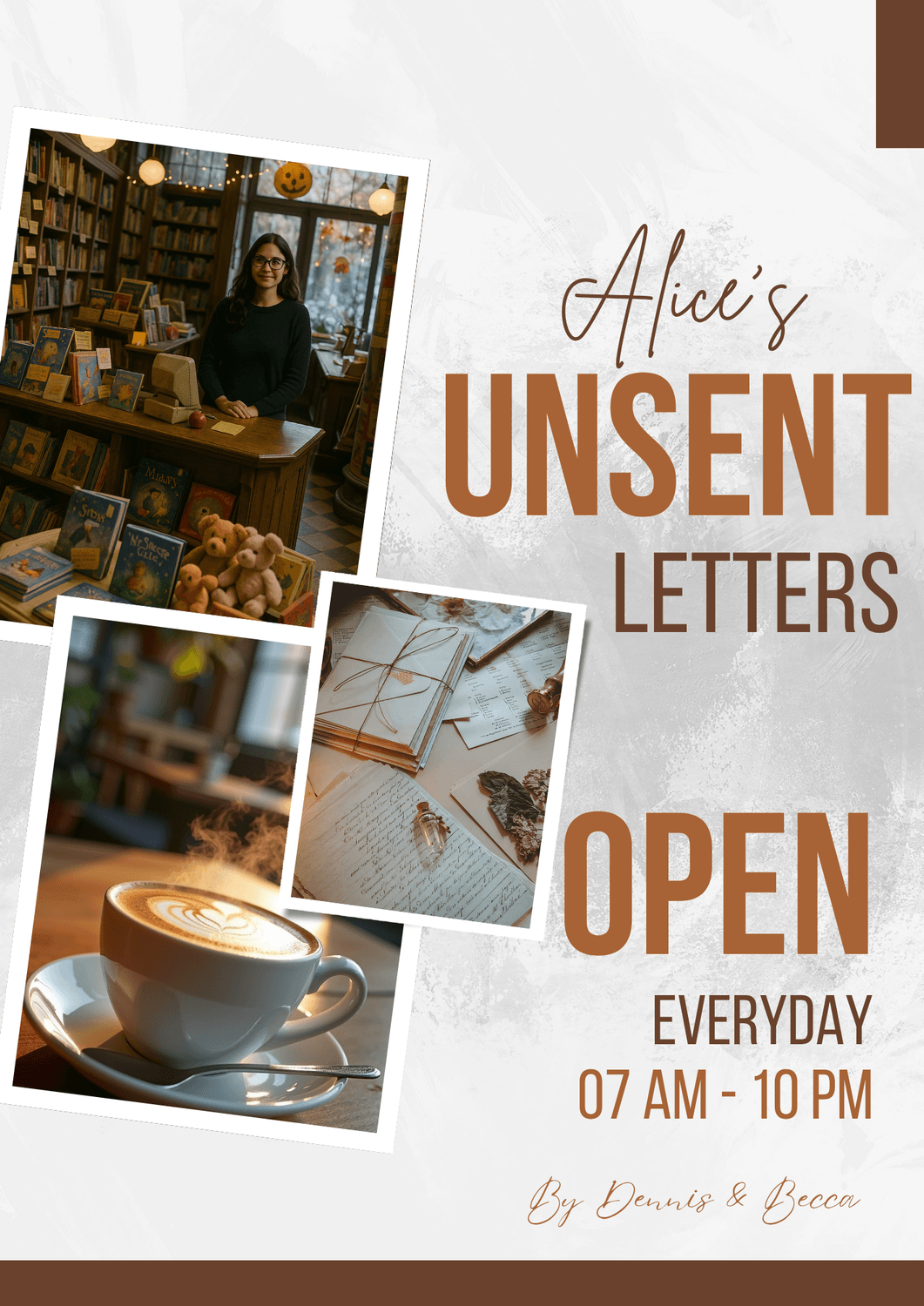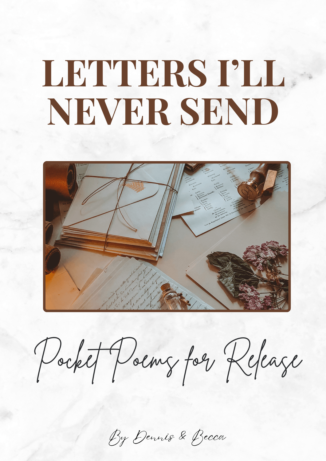 Dennis & Becca created the character Alice Rose Harper—a 32-year-old New Yorker and owner of The Little Letter Café—who discovers her late mother’s box of unsent letters and begins writing her own for healing and closure. Alice is the narrative voice of the main book (Alice’s Unsent Letters) and the author persona behind the three bonuses: Unsent Letters: Letters You’ll Never Send, Letters I’ll Never Send: Pocket Poems for Release (50 poems), and The Companion Workbook.